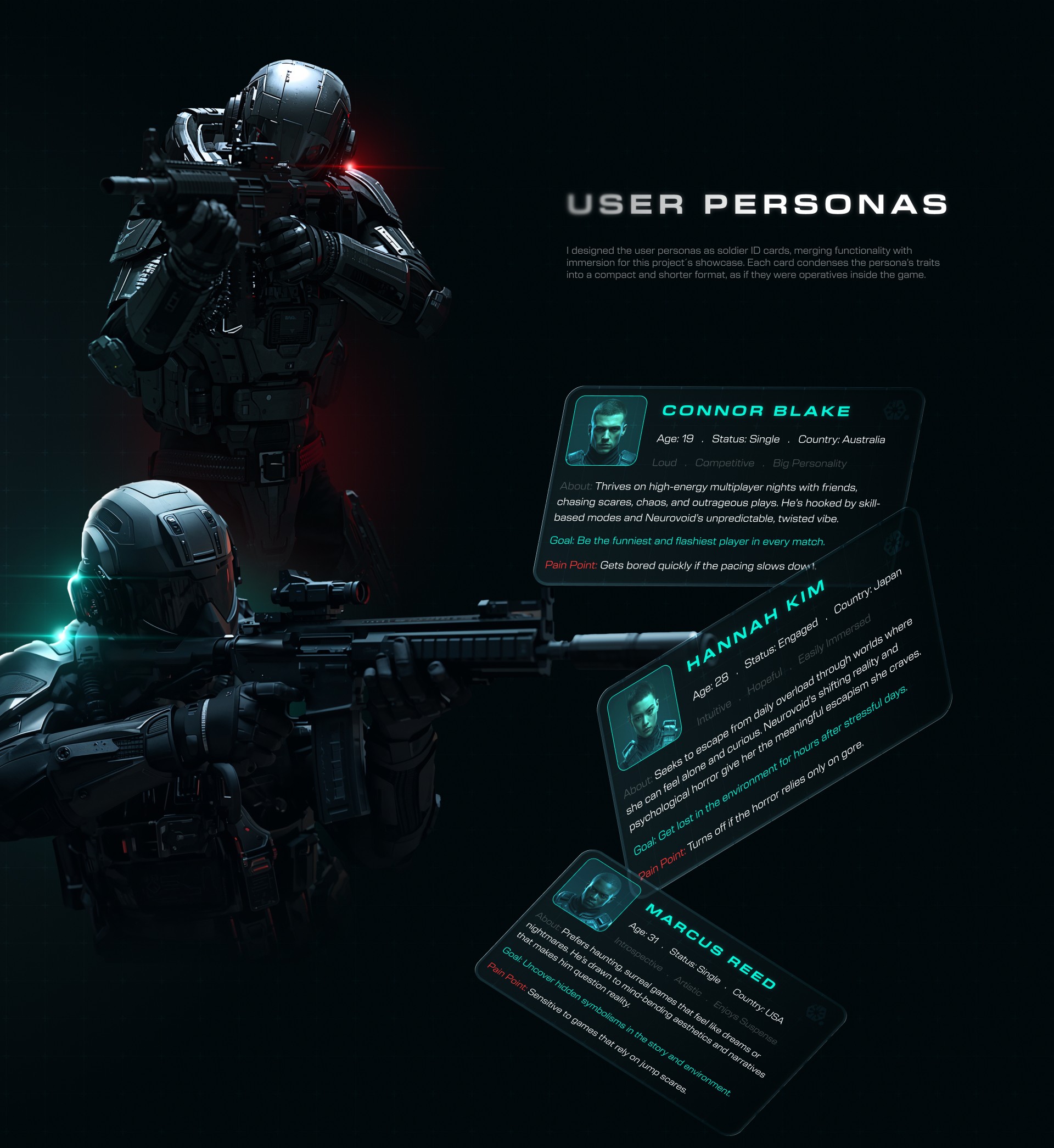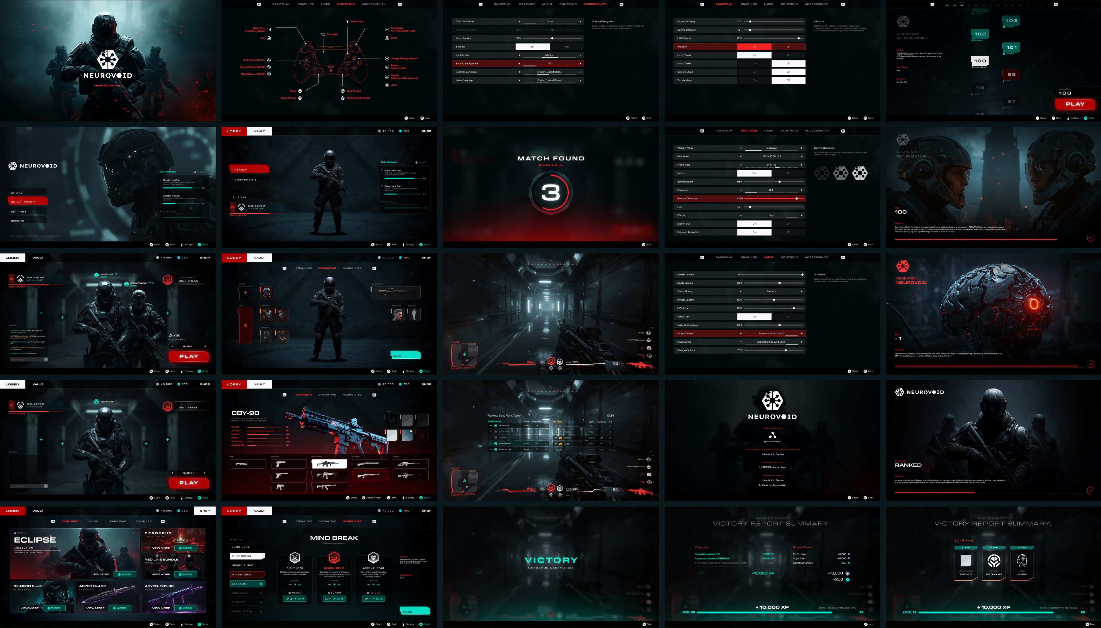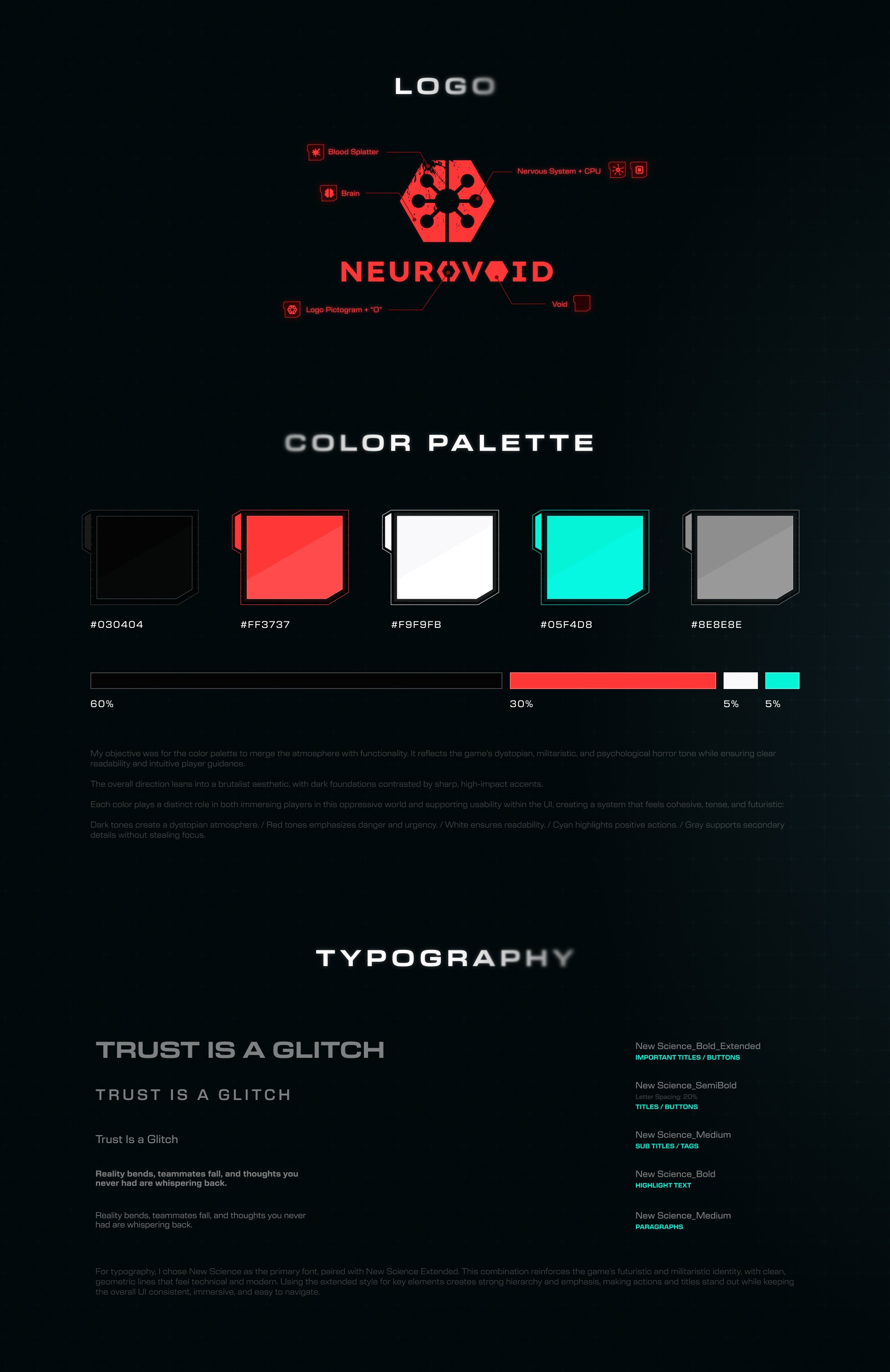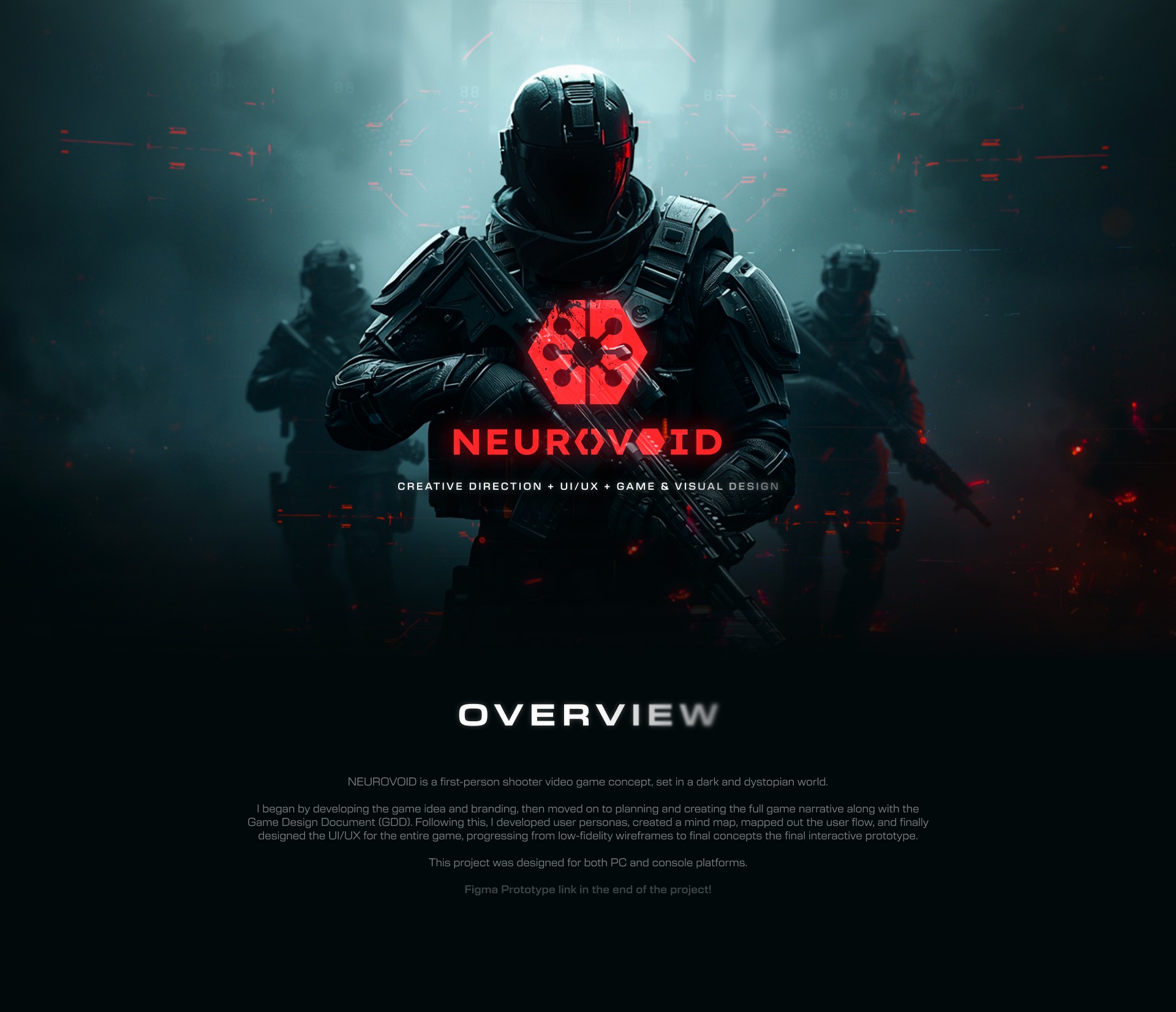 NEUROVOID is a first-person shooter video game concept, set in a dark and dystopian world. I began by developing the game idea and branding, then moved on to planning and creating the full game narrative along with the Game Design Document (GDD). Following this, I developed user personas, created a mind map, mapped out the user flow, and finally designed the UI/UX for the entire game, progressing from low-fidelity wireframes to final concepts the final interactive prototype (link in behance). This project was designed for both PC and console platforms.
